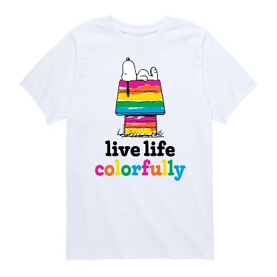 Peanuts - Live Life Colorfully - Men's Short Sleeve Graphic T-Shirt - From the best-loved comic strip in history comes officially licensed PEANUTS apparel for fans everywhere. Show your love for Charlie Brown, Snoopy, Woodstock, Lucy, Linus, Pigpen and the whole gang. Copyright Peanuts.