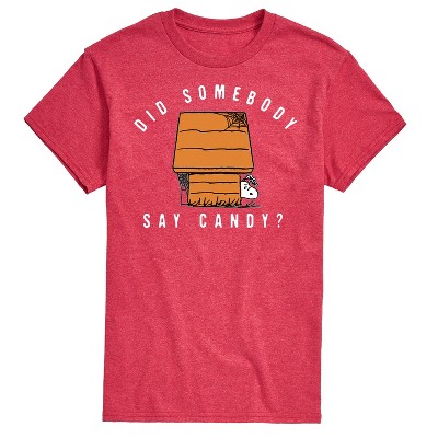 Peanuts - Say Candy Art - Men's Short Sleeve Graphic T-Shirt - From the best-loved comic strip in history comes officially licensed PEANUTS apparel for fans everywhere. Show your love for Charlie Brown, Snoopy, Woodstock, Lucy, Linus, Pigpen and the whole gang. Copyright Peanuts.