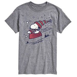 Peanuts - Snoopy Sledding - Men's Short Sleeve Graphic T-Shirt - From the best-loved comic strip in history comes officially licensed PEANUTS apparel for fans everywhere. Show your love for Charlie Brown, Snoopy, Woodstock, Lucy, Linus, Pigpen and the whole gang. Copyright Peanuts.