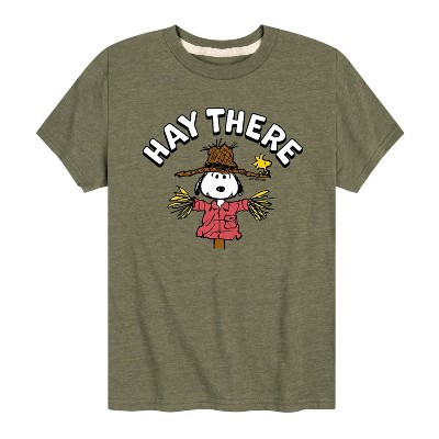 Peanuts - Snoopy Scarecrow Hay There - Men's Short Sleeve Graphic T-Shirt - From the best-loved comic strip in history comes officially licensed PEANUTS apparel for fans everywhere. Show your love for Charlie Brown, Snoopy, Woodstock, Lucy, Linus, Pigpen and the whole gang. Copyright Peanuts.
