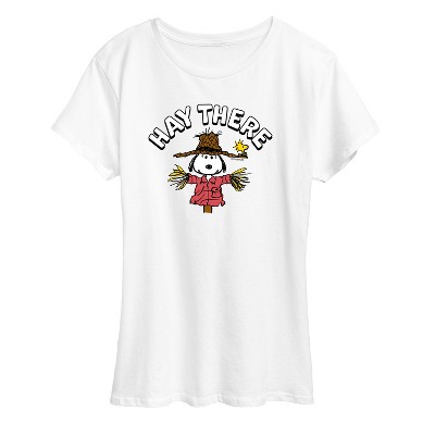 Peanuts - Snoopy Scarecrow Hay There - Men's Short Sleeve Graphic T-Shirt - From the best-loved comic strip in history comes officially licensed PEANUTS apparel for fans everywhere. Show your love for Charlie Brown, Snoopy, Woodstock, Lucy, Linus, Pigpen and the whole gang. Copyright Peanuts.