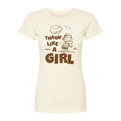 Peanuts - Throw Like A Girl - Men's Short Sleeve Graphic T-Shirt - From the best-loved comic strip in history comes officially licensed PEANUTS apparel for fans everywhere. Show your love for Charlie Brown, Snoopy, Woodstock, Lucy, Linus, Pigpen and the whole gang. Copyright Peanuts.