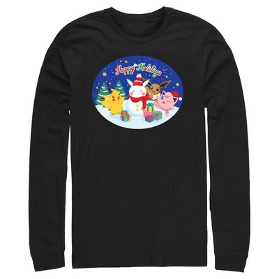 • Strut your stuff with this stylish new Christmas Men's Long Sleeve T-Shirt that is perfect for the holidays! Featuring Pikachu, Squirtle, Charmander, and Bulbasaur celebrating around a Christmas tree decorated with candy canes, bows, festive lights, and Pokemon-shaped ornaments, including Jigglypuff, Delibird, and Eevee.