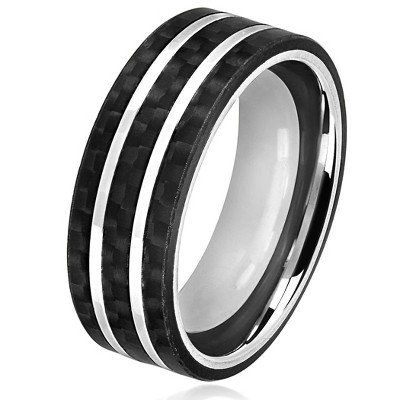 Make a modern fashion statement and make sure all eyes are on you when you wear this sharp and handsome men's band. This men's jewelry item features a polished mirror finish steel band with a raised matte black carbon fiber band.The eye-catching carbon fiber overlay gives this ring a modern and sophisticated edge. While the polished finish accentuates the ring's shine and elegance. Carbon fiber is a lightweight, durable high technology material. The carbon fiber and stainless steel construction enables this ring to withstand everyday activities.This ring's versatility allows you to wear it with casual attire or a sharp formal attire. This men's ring design and construction yields maximum comfort. The inner shank is domed and polished for a comfort fit. The exterior band has a smooth surface for a soft touch on your adjacent fingers.The ring has an 8 millimeter width and a thickness of 2.3 millimeters.