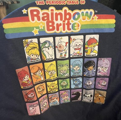 Head on down to Rainbow Land and bring back some fun and color to your life with exciting new officially licensed apparel for the whole family from the iconic 80's television series Rainbow Brite! This Men's Rainbow Brite Table of Characters Graphic T-Shirt features the periodic table of characters like Buddy Blue, Canary Yellow, Indigo, Kitty Brite, Patty O'Green, Puppy Brite, Spark, Starlite, Stormy, Sunriser, Twink, and more across the front. Darkness won't stand a chance when you rock one of these new Rainbow Brite designs!