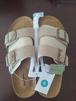 Move through casual days in comfy style with these Saul Suede Two Band Sandals from Goodfellow & Co™. The suede sandals feature a leather upper and contoured footbed for extra cushioning and comfortable walking, along with adjustable double straps to help you get just the right fit. Designed with an open toe for breezy comfort, simply sport them with anything from a crewneck T-shirt and shorts to a button-down and trousers for laid-back style.