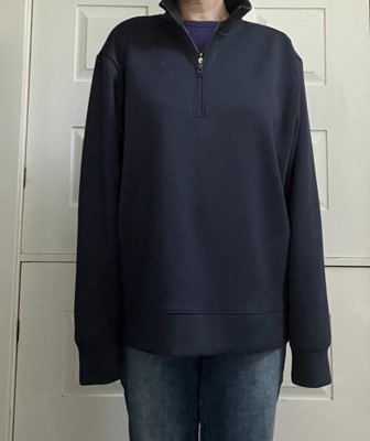 Spacer sweatshirt in a solid hue made from recycled polyester-, rayon- and spandex-blend doubleknit fabric for a fresh feel and all-day comfort wherever you go. Features a collared neckline with a quarter-length zippered front. Cut to an at-hip length with a ribbed cuff and hem for a snug, comfy fit.