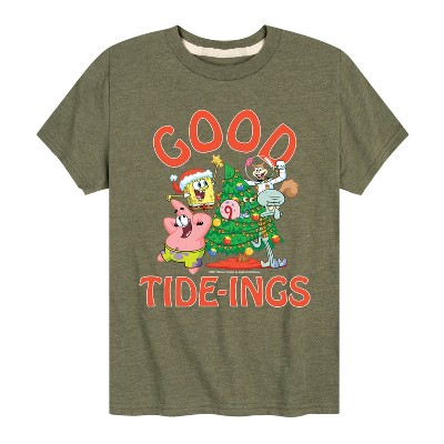 SpongeBob SquarePants - Good Tide Christmas - Men's Short Sleeve Graphic T-Shirt - Celebrate the essence of Nickelodeon's SpongeBob SquarePants with officially licensed apparel featuring unique designs crafted exclusively by Hybrid Apparel. Each piece brings beloved characters, iconic imagery, and memorable moments to life, offering SpongeBob SquarePants fans a one-of-a-kind way to showcase their passion.