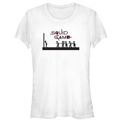 Stick figure silhouettes of characters playing tug of war are depicted across the front of this Men's Tee from the thrilling battle-royal style series Squid Game on Netflix!