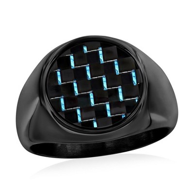 Make a modern fashion statement and make sure all eyes are on you when you wear this sharp and handsome men's band. This men's jewelry item features a polished stainless steel band with three rows of matte black carbon fiber bands contrasted by sharp steel stripes. The contrasting and eye-catching carbon fiber detailing gives this ring a modern style while the sharp silver stripes accentuate this ring with sharpness and sophistication. Carbon fiber is a lightweight, durable high technology material. The carbon fiber and stainless steel construction enables this ring to withstand everyday men's activities. This ring's versatility allows you to wear it with casual attire or a sharp formal attire. This men's ring design and construction yields maximum comfort. The inner shank is domed and polished for a comfort fit. The exterior band has a smooth surface for a soft touch on your adjacent fingers. The ring has an 8 millimeter width and a thickness of 2.5 millimeters.