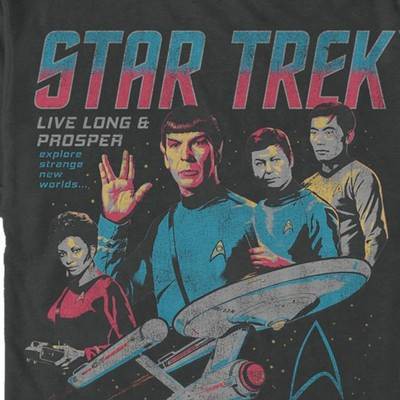 Beam me up Scotty! Follow the crew of the starship USS Enterprise as it completes daring space missions in the 23rd century, featuring all your favorites like Captain Kirk, Spock, and more! This officially licensed Men's Distressed Poster Tee features the USS Enterprise main crew with "Live Long and Prosper" printed on the side. Grab yours today and “Live Long and Prosper!