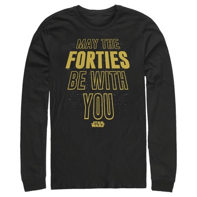 • Strut your stuff with this stylish new men's big & tall t-shirt that is perfect for birthdays! Featuring the statement: "May the Forties Be With You" in bold yellow lettering along with the classic Star Wars logo below.