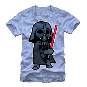 One of the most feared men in the galaxy gets a new look with the Star Wars Darth Vader Cartoon Heather Light Blue T-Shirt. A cartoon Darth Vader wielding his famous red lightsaber is printed on this awesome graphic tee.