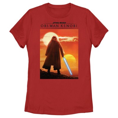 Join Jedi Master Obi-Wan Kenobi as he deals with his apprentice, Anakin Skywalker, turning to the dark side and becoming the infamous evil Sith Lord Darth Vader, in the exciting new action-packed limited series from Disney Obi-Wan Kenobi! This men's tee features a cool, colorful graphic of Obi-Wan Kenobi with a red sun and orange sun in the background. It's time to feel the Force with this galactic Star Wars graphic t-shirt!