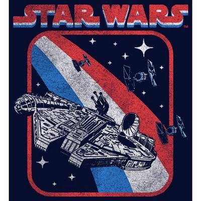 Make the Kessel Run in less than twelve parsecs this Fourth of July with an officially licensed Star Wars Patriotic Vintage Millennium Falcon Stripes Men's Graphic T-Shirt. A distressed graphic shows off Han Solo's ship, the Millennium Falcon, and TIE Fighters in a red, white, and blue pattern that is reminiscent of the American flag and is the perfect way to celebrate this summer! It's time to come to the Red, White, and Blue Side!