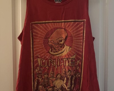 Join your favorite members of the Rebel Alliance and unite with the Star Wars Rebels Unite Red Tank Top. "Unite" is printed below Admiral Ackbar's face on this red tank top while Luke, C-3PO, R2-D2, Princess Leia, Chewbacca, Han Solo, Lando Calrissian, and Nien Nunb hold up rebel banners below.