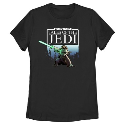 Join the Jedis from the prequel trilogy era in an exciting collection of animated short stories in Star Wars: Tales of the Jedi! This Men's Star Wars: Tales of the Jedi Yaddle Poster Graphic T-Shirt features the Jedi master Yaddle ready for battle holding his lightsaber with the animated TV series' logo printed above. Grab some out-of-this-world new Star Wars: Tales of the Jedi designs today and don't forget to use the force!
