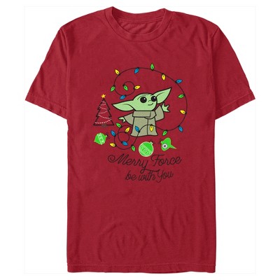 • Strut your stuff with this stylish new men's t-shirt that is perfect for showing off your holiday cheer! Featuring Grogu, the cute green baby alien peeking through a Christmas present, and the words: "Seasons Greetings," above him.