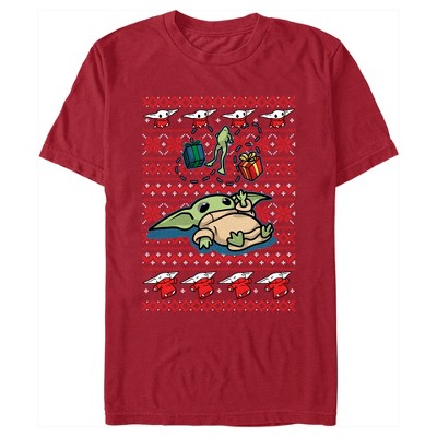 • Strut your stuff with this stylish new men's t-shirt that is perfect for showing off your holiday cheer! Featuring an ugly Christmas sweater design of Grogu, the cute green baby alien laying down while playing with a frog, and presents.