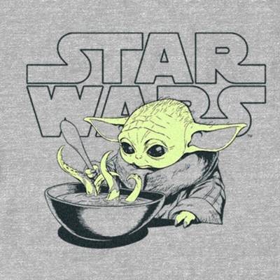When your Mandalorian armor is at the cleaners, give this officially licensed Star Wars: The Mandalorian Grogu Soup Logo Men's T-Shirt a try instead! Take up the reins as a Mandalorian gunfighter exploring the galaxy. This awesome Star Wars tee features a graphic of Grogu, the cute green baby alien eating a bowl of tentacle soup with the Star Wars logo in the background. Celebrate the Star Wars-inspired television series, The Mandalorian with this fun tee today!