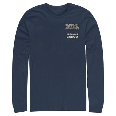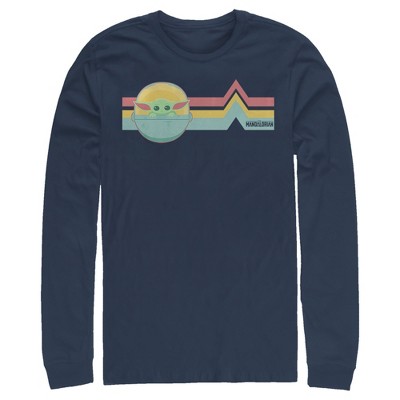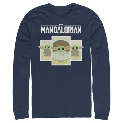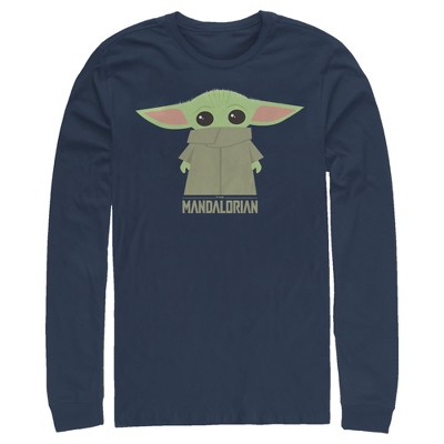 Is that a Baby Yoda? It couldn't be because this little nugget of cuteness was born after the Battle of Yavin and Yoda was born almost 900 years before that! But the similarity sure is striking isn't it? You'll be the envy of the galaxy in this Star Wars The Mandalorian The Child Text Men's Long Sleeve. Bounty hunting may be a complicated profession but figuring out how to dress yourself in the morning just got a little easier.