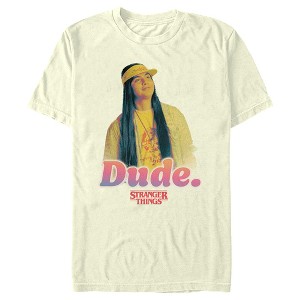 Turn your world upside down with this officially licensed Stranger Things Season 4 Men's Graphic T-Shirt! Your favorite 1980s-inspired Netflix television series is taking you back to Hawkins, Indiana to fight the evil creature, Vecna, who is terrorizing Max and other traumatized members of the town! Blast your favorite song and wear this awesome tee to fight the curse of Vecna today. This funny men's tee shows off your favorite pizza delivery guy, Argyle, with the text "Dude" in ombre font across the front.