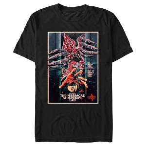 Turn your world upside down with this officially licensed Stranger Things Season 4 Men's Graphic T-Shirt! Your favorite 1980s-inspired Netflix television series is taking you back to Hawkins, Indiana to fight the evil creature, Vecna, who is terrorizing Max and other traumatized members of the town! Blast your favorite song and wear this awesome tee to fight the curse of Vecna today. This men's tee features an 80s horror movie-style poster from chapter 7 "Massacre at Hawkins Lab" of the show's 4th season!