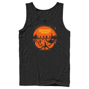 Turn your world upside down with this officially licensed Stranger Things Season 4 Men's Graphic Tank Top! Your favorite 1980s-inspired Netflix television series is taking you back to Hawkins, Indiana to fight the evil creature, Vecna, who is terrorizing Max and other traumatized members of the town! Blast your favorite song and wear this awesome tank to fight the curse of Vecna today. This men's tank features a cool graphic of both the real world and the upside down with the silhouettes of Eleven, Lucas, Mike, Dustin, Max, Will, and the monsters from the upside down the Demogorgon, Demobat Mind Flayer with a cool orange background!