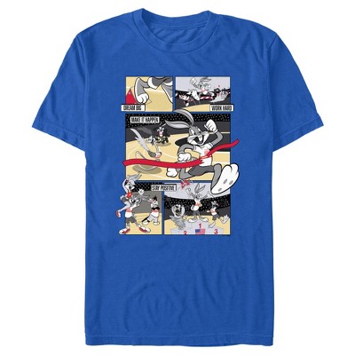 • Strut your stuff with this stylish new men's t-shirt that is perfect for every occasion! Featuring comic panels with Bugs Bunny, Tasmanian Devil, Sylvester, and Daffy Duck in a track and field competition as Bugs wins and celebrates with flowers, Lola Bunny, and the words: "Dream Big Work Hard Make It Happen Stay Positive."
