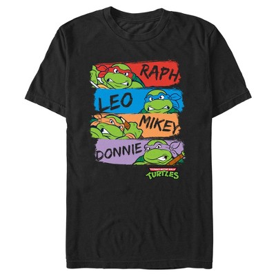 Cowabunga, dude! It's time to explore the New York sewers, indulge in a little pizza, and get ready for the best adventure ever with an awesome officially licensed Teenage Mutant Ninja Turtles Men's Artistic Panels Graphic T-Shirt featuring red, blue, orange, and purple panels with Donatello, Leonardo, Michelangelo, and Raphael showing their teeth in anger and their nicknames painted in black lettering across the front. If you're planning on fighting the Foot Clan, do it in your favorite Teenage Mutant Ninja Turtles design today!