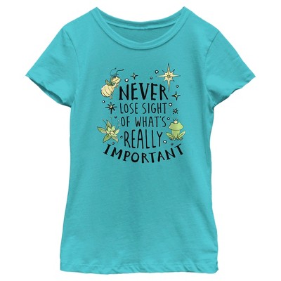 Kissing a frog doesn’t seem so bad if you end up with the officially licensed Disney The Princess and the Frog Tiana Never Lose Sight Men's Graphic T-Shirt! This tee features a pretty portrait of Tiana in a sketch art style, framed by green floral branches and the inspiring quote: "Never Lose Sight" in script font. All of your favorite characters are here to help add some magic to your closet with these fun designs, perfect for Disney fans everywhere!
