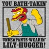Mhmmm donuts… mhmm officially licensed The Simpsons styles. Show off your favorite animated series with hilarious officially licensed apparel for the whole family featuring everyone's favorite dysfunctional family! This Men's The Simpsons Groundskeeper Willie Funny Quote Graphic T-Shirt features an angry groundskeeper Willie saying one of his funny quotes: "You Bath-Takin’ Underpants-Wearing’ Lily-Hugger!" in a distressed font. If anyone tries to steal your fashion, then just tell them to "eat my shorts" because you're not giving up this classic style from The Simpsons!