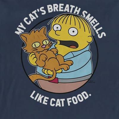 Mhmmm donuts… mhmm officially licensed The Simpsons styles. Show off your favorite animated series with hilarious officially licensed apparel for the whole family featuring everyone's favorite dysfunctional family! This Men's The Simpsons Ralph and His Cat Graphic Long-Sleeve T-Shirt features a scared Ralph holding a brownish cat, encircled by the text "My Cat's Breath Smells Like Cat Food" in white bold lettering. If anyone tries to steal your fashion, then just tell them to "eat my shorts" because you're not giving up this classic style from The Simpsons!