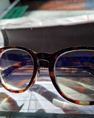 Minimize glare from digital screens with these Brown Tortoise Print Round Blue Light Filtering Reading Glasses from Goodfellow & Co™. These mens' reading glasses feature a round full-rim frame with a dark brown tortoiseshell print for an on-trend look. Fitted with clear anti-blue light lenses, they offer advanced protection from blue light emitted from digital screens and devices. The lightweight construction offers comfortable all-day wear, while the hinged temples and molded nose rest ensure a perfect stay-put fit. Plus, the UV-resistant properties help to safeguard your eyes from harmful UV rays.