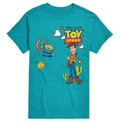You've got a friend in this officially licensed Pixar Toy Story '90s Pop Character Grid Men's Big & Tall Graphic T-Shirt! Don't worry if there's a snake in your boot because Woody is here to save the day with this awesome vintage graphic that shows off Woody, Rex, Hamm, and Buzz Lightyear in a distressed '90s pop frame on the front! First step to infinity and beyond; second step to out-of-this-world fashion with Toy Story-inspired styles!