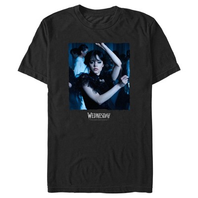 Join Wednesday Addams, the death-obsessed daughter from the iconic Addams Family franchise as she attends Nevermore Academy, hones her psychic abilities, and solves age-old mysteries in the new series Wednesday from Netflix! This officially licensed Wednesday Dance Scene Men's Graphic T-Shirt features a picture from the iconic dancing scene across the front along with the series' logo at the bottom. Get some new Wednesday designs and embrace the darkness!