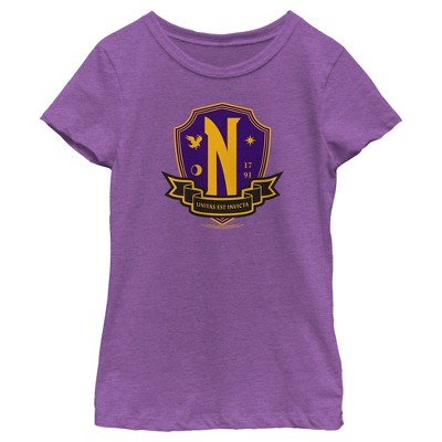 Join Wednesday Addams, the death-obsessed daughter from the iconic Addams Family franchise as she attends Nevermore Academy, hones her psychic abilities, and solves age-old mysteries in the new upcoming series Wednesday from Netflix! This officially licensed Wednesday Nevermore Academy Men's Graphic T-Shirt features the text "Nevermore Academy" alongside Wednesday in her school uniform, with the Nevermore Academy stretching out behind her in purple print. Get some new Wednesday designs and embrace the darkness!