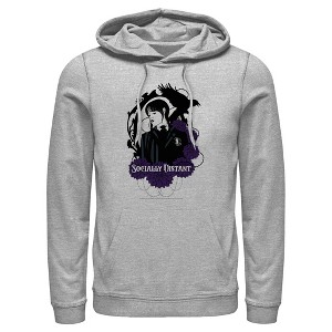 Join Wednesday Addams, the death-obsessed daughter from the iconic Addams Family franchise as she attends Nevermore Academy, hones her psychic abilities, and solves age-old mysteries in the spine-chilling new series Wednesday from Netflix! This officially licensed Wednesday Socially Distant Men's Graphic Hoodie features an artistic illustration of Wednesday framed by a raven, flowers, barbed wire, and the text "Socially Distant" across the front. Get some new Wednesday designs and embrace the darkness!