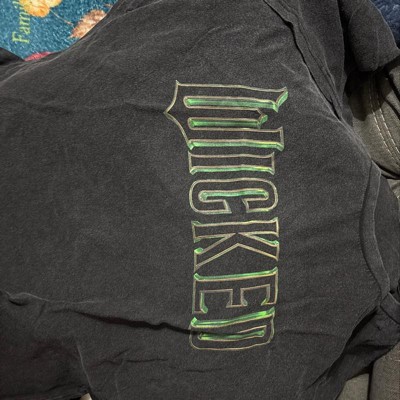 Shirt is not at all what is pictured it does not have anything on the back of the tee. It’s not even licensed Wicked merch! Very disappointing