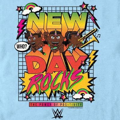 • Strut your stuff with this stylish new men's t-shirt that is perfect for every occasion! Featuring a cartoon version of the wrestling trio along with bold rainbow-colored text that reads: "New Day Rocks the Power of Positivity."