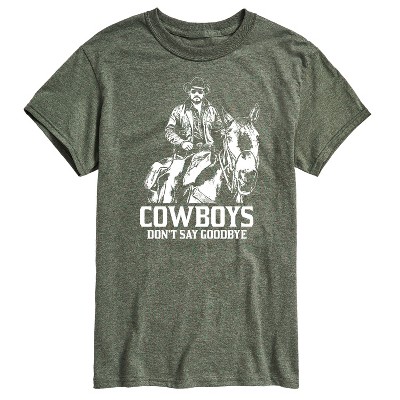 Yellowstone - Cowboys Don't Say Goodbye - Men's Short Sleeve Graphic T-Shirt - Saddle up with Yellowstone graphic apparel that captures the rugged spirit of the hit series. Featuring bold designs inspired by the Dutton family—John, Beth, Rip Wheeler, Kayce, and more—each piece reflects the grit, loyalty, and high-stakes drama of life on the ranch. Perfect for fans who live for Western toughness and power.