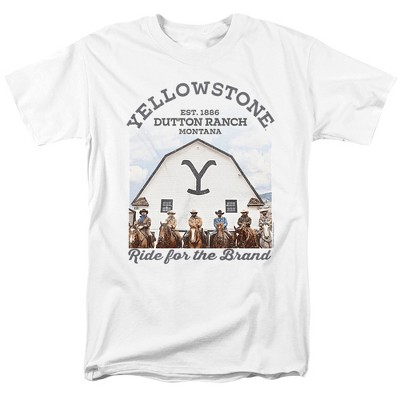 Get ready to head back to the West to watch the Dutton Family endure the dangerous and complicated ordeals of 19th century Montana ranching life in this officially licensed Yellowstone Riders of the Ranch Tee! Featuring the words "Yellowstone Dutton Ranch, Montana" and the silhouettes of three men in cowboy hats riding horses on the Montana landscape.