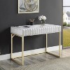 Create an elegant workspace that is multi-functional with this show-stopping writing desk. The drawer reveals storage space for all your supplies, helping keep your area organized and clutter-free. White, Blue, or Walnut wood finished table supported by gold steel legs gives the desk a lustrous look that will elevate any space. Built-in power outlets with USB ports make it easy to connect your devices. Pair with a gold mirror, and this desk can also be a vanity table!