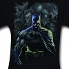Made from 100% cotton, this black t-shirt features an image of Batman front and center, stagnant and stoic regardless of the haunting, lingering, phantom memories of Batman's more...pervasive opposition!  Batman might not be in current conflict with a particular rogue, but the memories of past contentions with unabashedly psychotic malcontents swirl and saturate Batman's present awareness. Yep, the stain on Batman's psyche left by the actions of certain, clown-painted individuals and their ilk is often times more difficult to deal with than Batman would ever care to admit. Thank goodness there's always the Scarecrow to slap around, dangle off a 32 story building and punch in the no-no's.