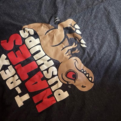 Relatable Dino Humor: Hilarious T-Rex graphic with the bold phrase “Hates Pushups”; a perfect laugh for gym goers, arm day avoiders, or sarcastic dinosaur lovers; great conversation starter at any casual event