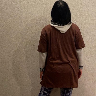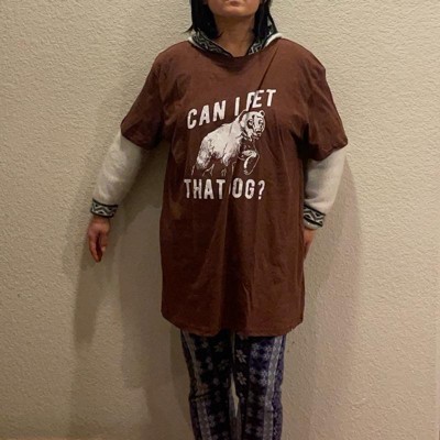 [This review was collected as part of a promotion.] Love this chocolate brown shirt, color so in this year. It fits the vibe of this bear meme too. Earthy and good. I’m 5’2 and 120 lbs and bought xl to layer under. It hits my kid thigh and so generous to go over a sweater. The thinner cotton polyester blend kind of disappoints, especially when the print is so good.