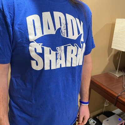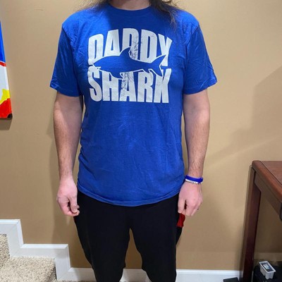 Funny Daddy Shark Design: Features a bold white “Daddy Shark” print with shark silhouette across the chest; a playful, family-friendly parody tee that dads with kids will love showing off at school drop-off or weekend outings