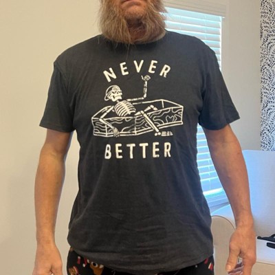 [This review was collected as part of a promotion.] My husband wears a size large T-shirt. This size large T-shirt fit him great. My husband absolutely loved the saying on this T-shirt. When he wore it around, he got so many compliments and people were hysterical. It is a very funny T-shirt. The style and quality of the T-shirt are very nice. It is a very reasonable price for a great T-shirt.