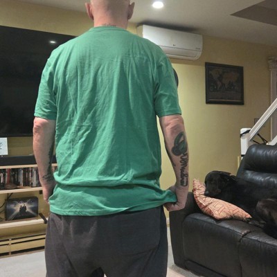 [This review was collected as part of a promotion.] My fiance is 5', 7" tall and weighs about 180 pounds. He usually wears a size large, which is what he's wearing here. This fit him perfectly. The length of the torso and shoulder width were great on him. The material is soft and typical for a t-shirt. The saying is great and the design is not too much.