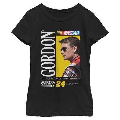 Join the ranks of the most successful teams with these new officially licensed NASCAR styles for the whole family! Shift your wardrobe into high gear with this Men's Jeff Gordon Racing Car Number 24 Graphic T-Shirt featuring Jeff Gordon's name in retro, gradient lettering, his iconic red No. 24 race car, and authentic company and auto racing logos proudly displayed across the front. Whether you're in the stands or just cruising through your day, you'll be racing to the front of the pack in both looks and fandom!